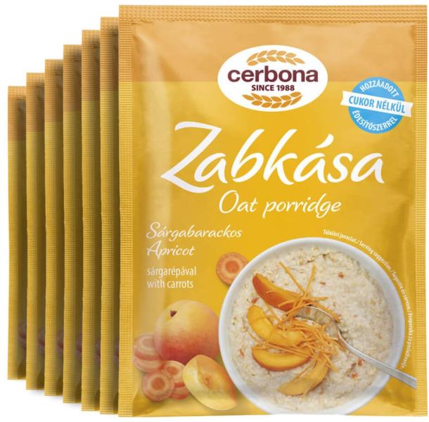 Cerbona Sárgabarackos zabkása, hozzáadott cukor nélkül, édesítőszerrel - Heti csomag / 7 x 50 g Élelmirost-forrás, teljes értékű zabbal. Zabpehely és tejporos porkeverék sárgarépával, hozzáadott cukor nélkül, édesítőszerrel. Összetevők: - Lapított zabpehely (glutén) 52%, - Édesítőszer: maltitok, - Sovány tejpor, - Kukoricakeményítő, - Aszalt sárgabarack darabok