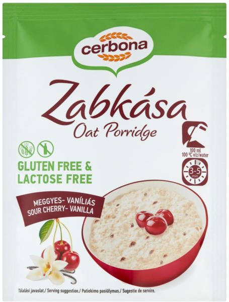 Cerbona gluténmentes, laktózmentes, meggyes-vaníliás zabkása 50 g Meggyes-vaníliás zabkása, gluténmentes, laktózmentes, tejmentes Összetevők: - Gluténmentes lapított zabpehely 52%, - Kukoricakeményítő, - Cukor, - Glükózszirup, - Fagyasztva szárított gyümölcsdarabok (meggy 0,8%, feketeribizli 0,7%), - Étkezési só, - Aromák, - Vanília őrlemény, - Savanyúságot szabály
