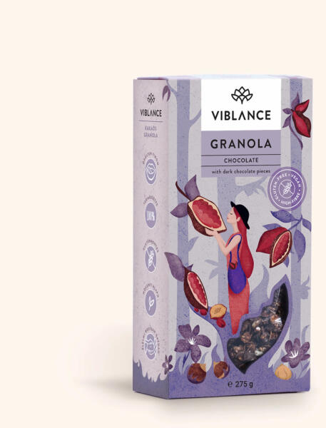 Viblance granola csokis 275 g ÉLMÉNY MINDEN REGGEL A gyerekek, és a felnőni nem hajlandó nagykorúak kedvence a kakaós granolánk, amit a legselymesebb ízű kakaóval ízesítünk. Igazi felemelő finomság, melynek karakterét a természetes kókuszvirág nektár domborítja ki igazán. A kakaó jó barátja, a ropogós törökmogyoró egészíti ki, míg kókusz és gyümölcsös illatú