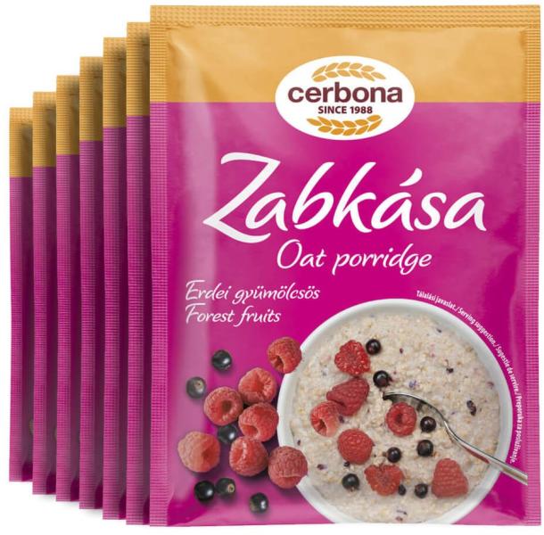Cerbona Erdei-gyümölcsös zabkása - Heti csomag / 7 x 55 g Élelmirost-forrás, teljes értékű zabbal. Zabpehely és tejporos porkeverék feketeribizlivel és málnával. Összetevők: - Lapított zabpehely (glutén) 52%, - Kukoricakeményítő, - Cukor, - Sovány tejpor, - Glükózszirup, - Fagyasztva szárított gyümölcsdarabok (feketeribizli 0,6%, málna 0,5%), - Aromák, - Étkezési s