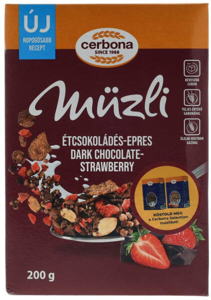 Kóstold meg a Cerbona étcsokoládés-epres müzlit! Kevesebb cukor, teljes értékű gabona, és gazdag rostforrás, ami feldobja a reggeleidet!