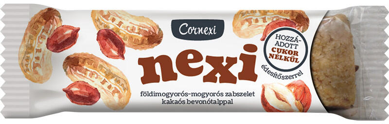 Cornexi nexi zabszelet földimogyoró-mogyoró édesítőszerrel 45 g Téglatest alakú kellemes mogyorós zabszelet hozzáadott cukor nélkül Átlagos tápérték: 391 kcal Energia: 1631 kJ Zsír: 18 g amelyből telitett zsírsavak: 11 g Szénhidrát: 61 g amelyből cukrok: 0,7 g amelyből poliolok: 33 g Rost: 5,2 g Fehérje: 6,9 g Só: 0,18 g.