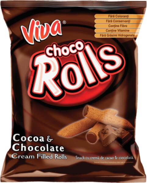 Viva choco rolls kakaós-csokoládés krémmel töltött extrudált gabonarudacska 100 g Hivatalos magyarországi forgalmazótól. Összetevők: Búza liszt (glutén), Rizsliszt és kukoricaliszt, Cukor, Pálmarizs, Zsírszegény kakaó 9,6%, Tejsavópor (laktóz, tejfehérje), Sovány tejpor, Csokoládé 1,5% (cukor, kakaó massza, teljes tejpor, sovány tejpor, kakaóvaj, emulgeálószer: szója