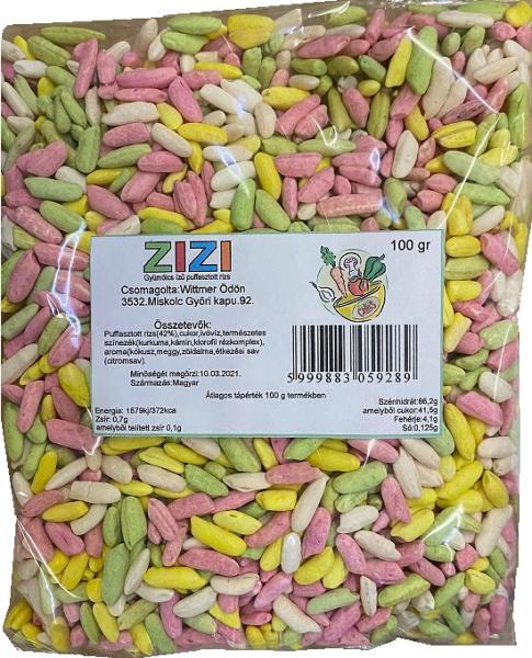 WITTMER ZIZI PUFFASZTOTT RIZSPEHELY 100G Ös szetevők: puffasztott rizs (42%), cukor, ivóvíz, természetes színezék (kurkuma, kámin, klorofil rézkomplex), aroma (kókusz, meggy, zöldalma, étkezési sav (citromsav) Á tlagos tápérték 100 termékben: Energia: 1579kj/372 kcalZsír: 0,7g amelyből telített zsír: 0,1g Szénhidrát. 86,2g amely