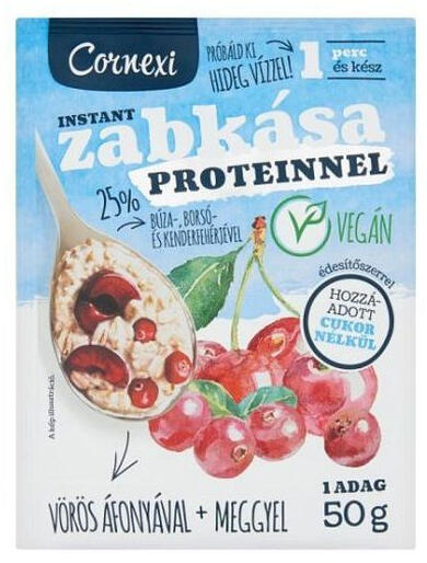 Főként zabpehelyből, növényi fehérjéből és egyéb alkotókból álló keverék. A termékre jellemző, gabonás, vörösáfonyás-meggyes illat, nem túl édes, gabonás, vörösáfonya-meggyes íz. 50 g-os vegán proteines zabkása; Cornexi termék reggelik készítéséhez.