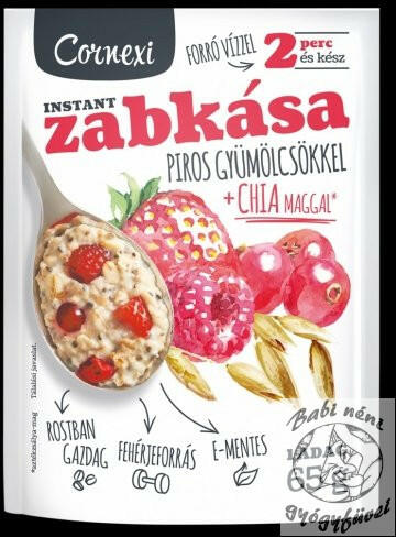 Összetevők:zabpehely60 %, cukor, soványtejpor, kukoricakeményítő, chia mag 4 %, aszalt vörös áfonya apríték 2 % (vörös áfonya, cukor, növényi olaj, dextróz), liofilizált gyümölcsök 1,5 % (málna darab, eper darab, egész piros ribizli), aroma. Miért pont a chia mag? - kiváló esszenciális omega-3 és -6 zsírsavforrás - antioxidánsokban, ásványi anyagokban gazdag - maga