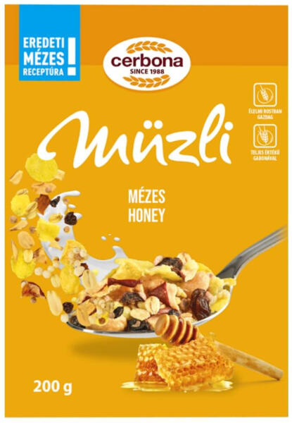 Cerbona Mézes müzli 200 g (dobozos) A mézes müzli csökkentett cukor tartalmú, értékes tápanyagokban és élelmi rostban gazdag, ezáltal jól beilleszthető az egészséges táplálkozásba. A mézes müzlit a méz, és a 4 fajta gabonából készült ropogós gabonapelyhek és a lapított zabpehely teszik ellenállhatatlanul finommá. Kóstold meg a többi müzlinket is! - 4 féle gabon