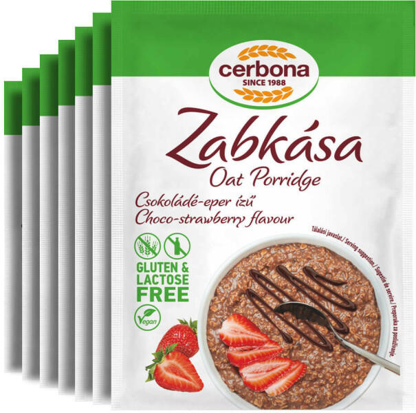 Cerbona glutén- és laktózmentes csokoládés-epres zabkása - Heti csomag / 7 x 50 g Csokoládé-eper ízű zabkása, gluténmentes, laktózmentes, tejmentes Összetevők: - Gluténmentes lapított zabpehely 51%, - Kukoricakeményítő, - Cukor, - Glükózszirup, - Zsírszegény kakaópor, - Fagyasztva szárított gyümölcsdarabok (eper 0,8%, málna 0,5%), - Étkezési só, - Aromák. Allergé