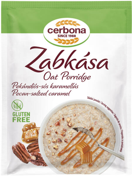 Cerbona gluténmentes zabkása pekándiós-sós karamellás 50 g Összetevők: gluténmentes lapított zabpehely 47%, cukor, kukoricakeményítő, sovány tejpor, glükózszirup, inulin (növényi rost), omlós karamella 2,0% [cukor, glükózszirup, cukrozott sűrített tej (sűrített tej, cukor), vaj (tejből)], pekándió darabok 1%, étkezési só, aromák, antioxidáns: rozmaring kivonat. A t