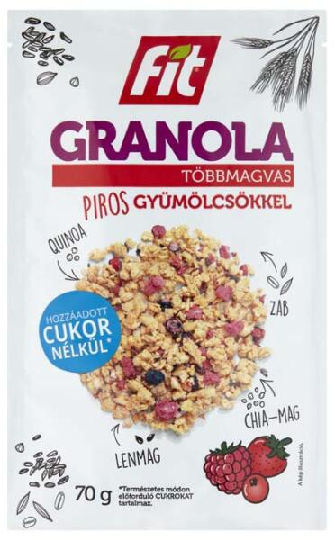Piros gyümölcsös granola hozzáadott cukor nélkül.