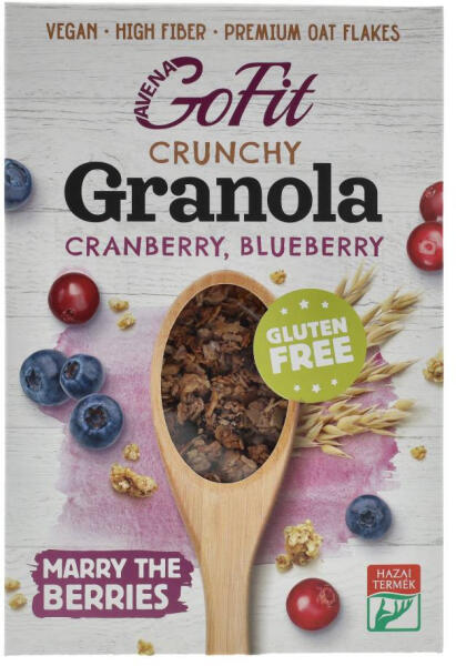 Avena GoFit gluténmentes granola áfonya ízesítéssel, magas rosttartalommal, vegán, hozzáadott cukor nélkül, édesítőszerekkel.