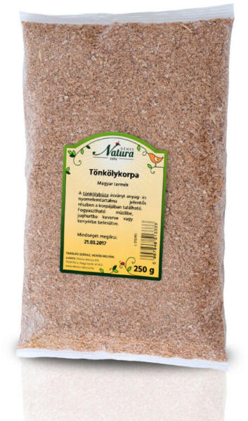 A tönkölybúza ásványi anyag- és nyomelemtartalma jelentős részben a korpájában található. Összetevők: tönkölybúza Al lergének a termékben: glutén Felhasználás i javaslat: Fo?gyaszt?ha?tó müzlibe, joghurtba keverve vagy kenyérbe belesütve. Átlagos tápérték 100 g termékben:Energia 1358 kJ (321 kcal)Zsír 3,4 g-amelyből telített zsírsavak 0,8 gSzénhidrát 56,2 g-ame