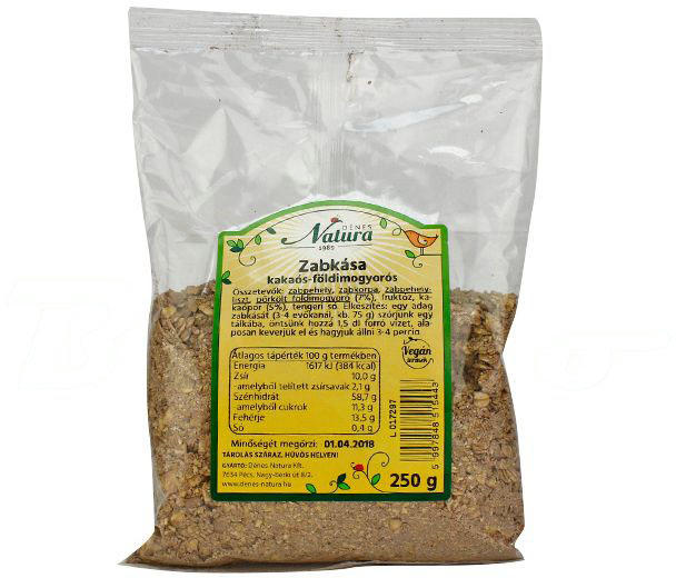 Összetevők: zabpehely, zabkorpa, zabpehelyliszt, pörkölt földimogyoró (7%), fruktóz, kakaópor (4%), tengeri só. Allergének a termékben: glutén, földimogyoró (aláhúzással jelölve az összetevők között) Nyomokban szezámot tartalmazhat. Átlagos tápérték 100 g termékben: Energia 1617 kJ (384 kcal) Zsír 10,0 g - amelyből telített zsírsavak 2,1 g Szénhidrát 58,7 g - amel