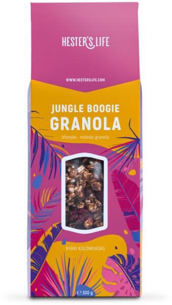 Hester`s Life jungle boogie áfonyás-málnás granola 300 g A Hester’s Life limitált nyári kiadású Jungle Boogie Áfonyás- Málnás Granola a legfinomabb nyári gyümölcsök, a vaníliás granola és a ropogósra pirított puffasztott quinoa izgalmas kombinációja. A granolában található áfonya és málna liofilizálással készült, mely más néven fagyasztva szárítás. Ez a legi