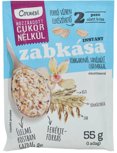 Cornexi zabkása chia maggal, hozzáadott cukor nélkül. Többgabonás, fehérjével dúsított, laktató reggeli a vanília édes ízével. 2 perc alatt kész!
