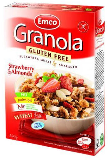 Gluténmentes müzli eperrel és mandulával. Gabonakeverék. 340 g-os gluténmentes müzli; EMCO termék az egészséges élelmiszerek kedvelőinek.