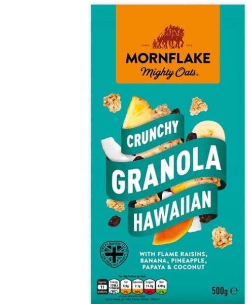 A ropogós granola Hawaiian a mornflake zabpehely, aszalt gyümölcsök, kókuszdió és más gondosan válogatott összetevők ízletes keveréke. Magas rosttartalmú, így gondoskodik az optimális emésztésről, és játékosan tápláló, ropogós reggelit, uzsonnát vagy tízórait biztosít.