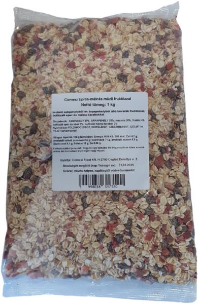 Cornexi epres-málnás müzli 1kg Hivatalos magyarországi forgalmazótól. Leírás: Instant zebpehelyből és árpapehelyből álló keverék fruktózzal, liofolizált eper és málna darabokkal. Összetevők: Zabpehely 47%, árpapehely 26%, mazsola 20 %, fruktóz 4%, liofilizált eper darabok 2 %, liofilizált málna darabok 2%. Nyomokban földimogyorót, dióféléket, szezámmagot, szóját