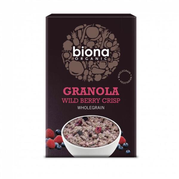 Prémium bio reggeli granola egészséges zab darabokkal, amely folyamatos energiát biztosít egész reggel. Összetevők : teljeskiőrlésű zabpehely* (68%), nyers nádcukor*, pálmazsír* (fenntartható gazdálkodásból), puffasztott rizs* (rizs*, malátázott árpa*, tengeri só), búzaszirup*, fagyasztott, szárított bogyós gyümölcskeverék* (3%) (szeder*, áfonya*, szamóca*, fekete ep