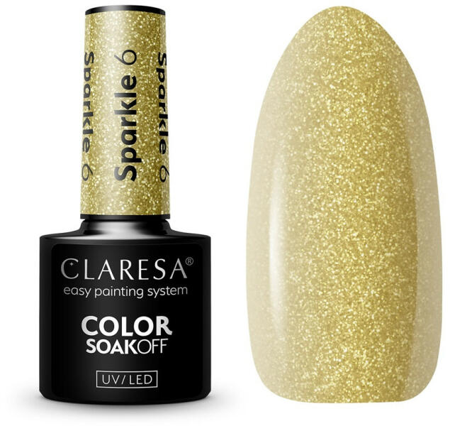 Claresa Gél lakk SPARKLE 06# Az aranynak sok neve van. A SPARKLE 06# szín a világos arany kivételesen világító, tiszta árnyalata. Úgy ragyog, mint a legszebb tűzijáték szilveszterkor!Ezzel a színnel aranyszínű összképet varázsolhatsz, ha különféle dekorációkban használod. Készíts egy fényes francia manikűrt vagy egy díszes örvénylő körmöt. Készítsd el a legszebb