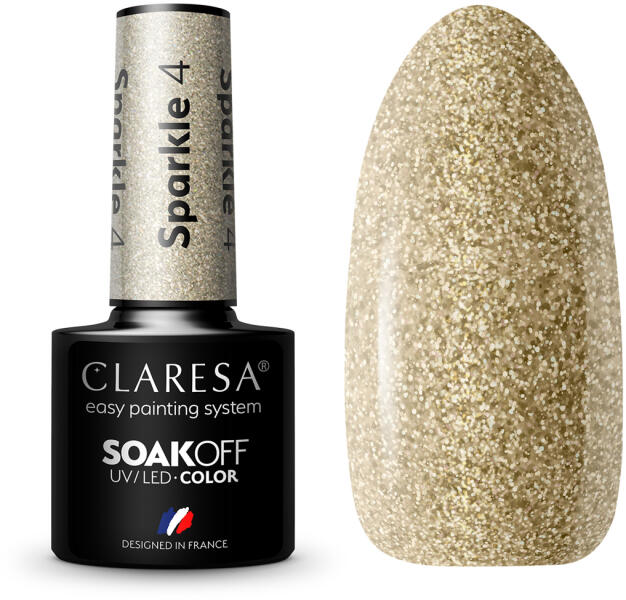 CLARESA Lakier hybrydowy SPARKLE 4 Lakiery hybrydowe to rozwiązanie, na które stawia coraz więcej kobiet. Swoją popularność zawdzięczają głównie niezwykłej trwałości. Odpowiednio wykonany manicure hybrydowy pozwala cieszyć się pięknym lookiem na dłoniach nawet do 3 tygodni! Lakiery hybrydowe Claresa to aż 300 kolorów zamkniętych w eleganckiej, szklanej buteleczce, na której ko