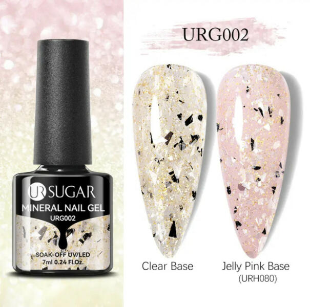 Ur Sugar Minerál/ásvány hatású gél lakk 7ml Áttetsző alapban ásványkő hatású díszítő elemek vannak így bármelyik színnel kombinálhatjuk. Kötési ideje Led-ben 1perc/ Uv-ban 2-3 perc.