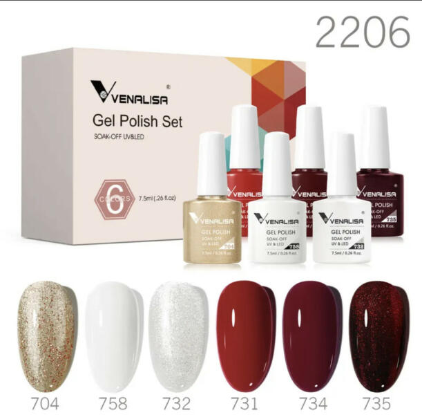 Venalisa Gél lakk szett Professzionális minőség, 7,5 ml-s kiszerelés. A színek erősen pigmentáltak, bármilyen bőrtónushoz kiválóan alkalmazkodnak. Maximum 2 vékony rétegben vigye fel de már egy réteg is elég a tökéletes fedéshez. Kötési ideje UV lámpában 2-3 perc, led lámpában 1 perc. Tartóssága kb 3-4 hét. A szett tartalma : 6DB Venalisa Gél lakk
