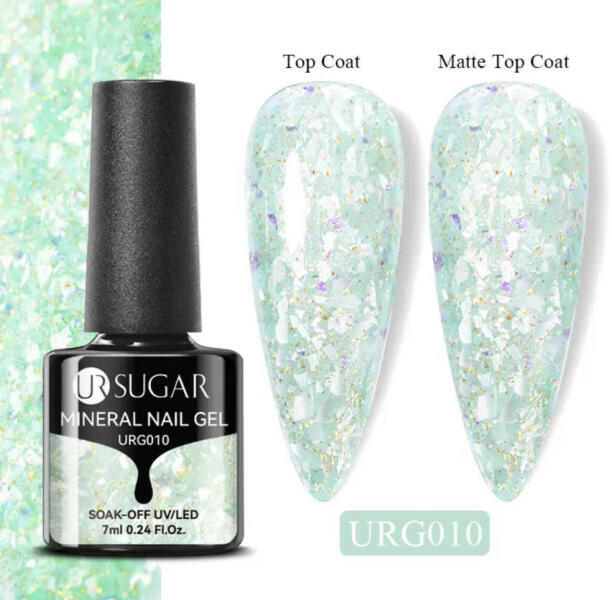 Ur Sugar Minerál/ásvány hatású gél lakk 7ml Áttetsző alapban ásványkő hatású díszítő elemek vannak így bármelyik színnel kombinálhatjuk. Kötési ideje Led-ben 1perc/ Uv-ban 2-3 perc.