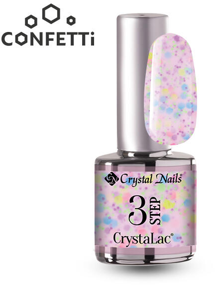 Az emelkedett hangulatú baráti, vagy családi összejövetelek, a bulik, egy jó nyaralás, minden örömteli élménynek, ami az életet élteti, az érzését juttatja eszünkbe a 3 Step CrystaLac termékcsoport Confetti kollekciója. Különböző méretű színes flittereket és csillámokat tartalmazó Milky hatású árnyalatok. Önmagában is alkalmazhatóak két vékony, vagy 1 normál v