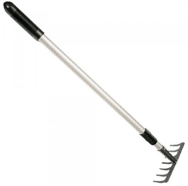 A Muta kerti gereblye alumínium, teleszkópos nyéllel készült. A nyél hossza 650-1170 mm között szabályozható. A gereblyefej hossza 75 mm, szélessége 150 mm. Az ergonomikus, csúszásgátlós nyél végén elhelyezkedő akasztólyuk elősegíti a szerszám egyszerű és biztonságos tárolását. A kerti gereblye hajlított fogazással van ellátva, elősegítve a könnyű húzást tala