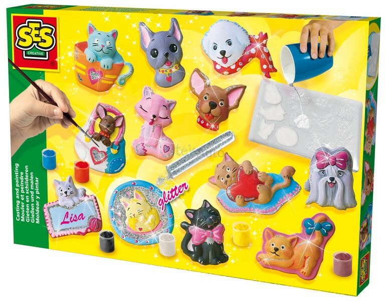 Formázz gipszből cicás vagy kutyás szobrokat, ajándéktárgyakat! A SES Kutyák és cicák 3D gipszkiöntő készlet különböző öntőformákat, festéket, csillámot és gipszet rejt magában, amikkel különféle apró gipsztárgyakat tudsz kiönteni. A formákból összesen 12 figurát tudsz elkészíteni, köztük táskás kutyát, vagy nyújtózó cicát is. Keverd el a port kevés v