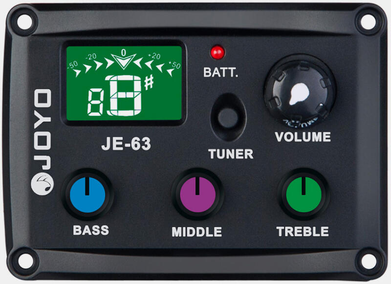 Feature 1: Built-in tuner (mutes output signal when in use) Feature 2: 2 color display Feature 3: Seamless, separate volume control Feature 4: Phase turn button Feature 5: Powered by 9 V battery Feature 6: Separate battery compartment with output jack EQ: 3-band EQ featuring single bass, middle & treble controls Including: piezo pickup (bass), output/battery compartment device, and cable clamp