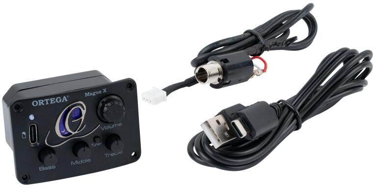 Color: Black Feature 1: Rechargeable pickup system / Ukulele Feature 2: Built-in tuner (mutes output signal when in use) Feature 3: 2 color display Feature 4: Phase button Controls: Seamless, separate volume control EQ: 3 band EQ featuring single BASS, MIDDLE & TREBLE controls Powered by: integrated rechargeable (USB-C) battery Including: 4-bar piezo pickup (ukulele), cable clamp, and USB-C ca