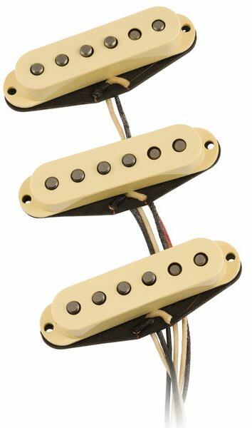 Fender Single-Coil hangszedő szett 3 Single coils For bridge, middle and neck position Output: Vintage Magnet material: Alnico 5 Staggered pole pieces Cap colour: Aged White Made in USA