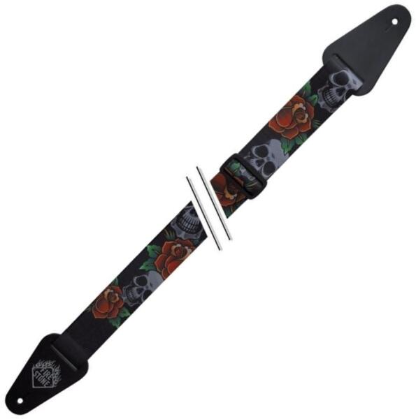 FIRE&STONE 531042 Gitárheveder Tatoo Edition Skulls and Roses Black 50 mm széles, magas minőségű nylon pánt 3 mm vastag bőr végek állítható hosszúság 89 cm és 153 cm között
