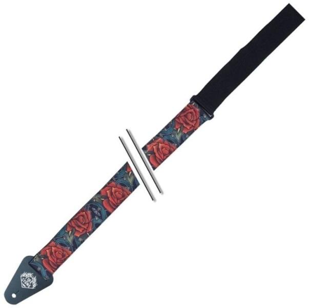 FIRE&STONE 531014 Gitárheveder Tattoo Edition Red Roses 50 mm széles nylonpánt 3 mm vastag bőr végek felvarrt tetoválás-minták állítható hosszúság: 106 - 130 mm