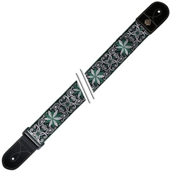 FIRE&STONE 531067 Gitárheveder Folkore Edition -Jacquard Zöld-fehér 50 mm széles szövetpánt szőtt jacquard-mintával igazi bőr végekkel, állítható hosszúságú 50 mm széles szövetpánt szőtt jacquard-mintával bőr végek, megerősített hevedertartó gomblyuk, fém csatt állítható hosszúság 83-143cm