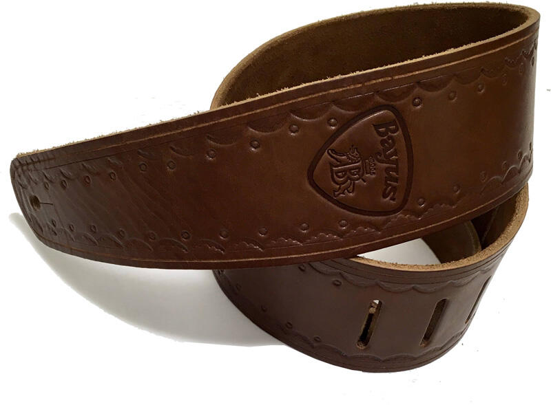 Növényi cserzésű, 3.00-3.50 mm vastagságú, Krupon marhabőr gitár heveder 100%-os prémium növényi cserzés Kézzel vésett minta Hossz: 120-146 cm Szélesség: 6,5 cm Magyar gyártmány