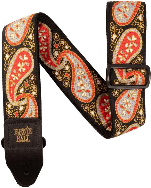 Széles 5cm-es heveder, strapabíró poliészterből. A színek nem eresztenek és nem nyúlik. Számítógép vezérlésű, extra erős gépi varrással rögzített prémium bőr végekkel, a bőr végeken arany színű Ernie Ball logóval. Extra állítható hosszúság 100 - 170 cm között.