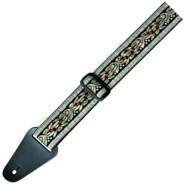 FIRE&STONE 531063 Gitárheveder Folklore Edition -Jacquard Világos, Fekete-arany 50 mm széles szövetpánt szőtt jacquard-mintával igazi bőr végekkel, állítható hosszúságú 50 mm széles szövetpánt szőtt jacquard-mintával igazi bőr végekkel, állítható hosszúságú