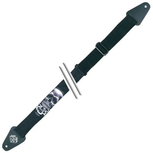 FIRE&STONE 531015 Gitárheveder Tattoo Edition Black-White Skull 50 mm széles nylonpánt 3 mm vastag bőr végek felvarrt tetoválás-minták állítható hosszúság: 106 - 130 mm