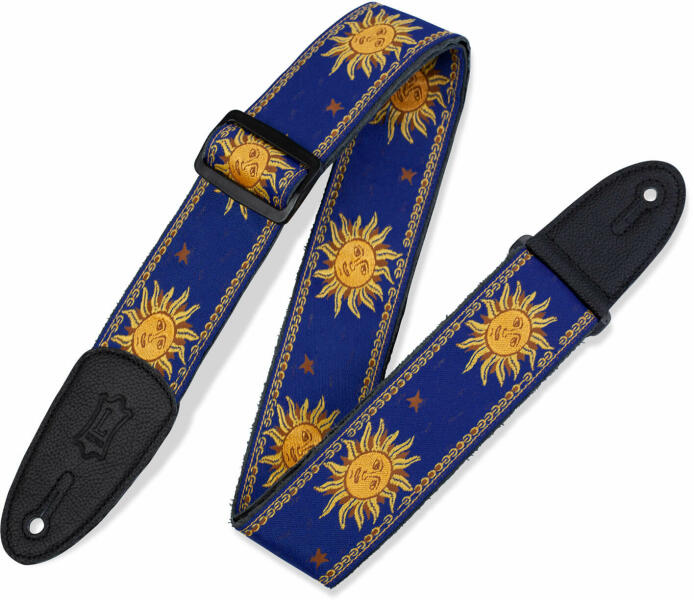 Állítható kék szőtt gitárheveder bőr végekkel, nap mintával