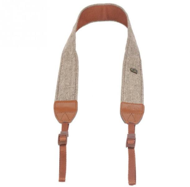 Vintage stílusú fényképezőgép nyakpánt. Világos szürke színű / bézs színű, a hátoldala közép barna, csakúgy mint a végei. A képekhez képest árnyalatnyi különbség előfordulhat. Egyik oldalán kis fényképezőgép betét fémből.