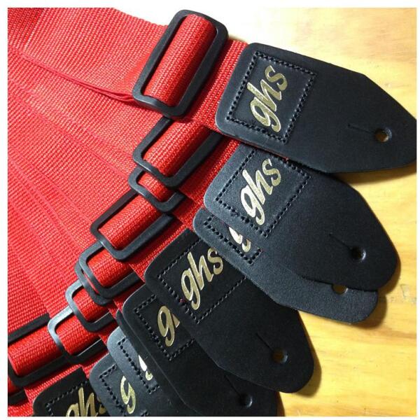 Állítható nylon gitár heveder, bőr végekkel, 5 cm széles, piros.