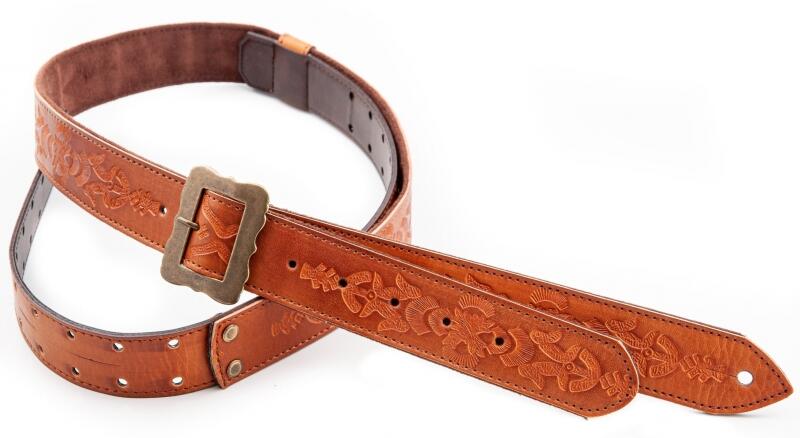 Ez egy automatizált szoftver általi fordítás:64 mm széles bőr gitárszíj a Flowering Vine sorozatból. A létraszerű előtolás-szabályozás lehetővé teszi a szíj hosszának beállítását 47/1194mm – 54/1137mm között. Az övet vágott és festett virágok és levelek díszítik, valamint a köztük futó szőlőt imitáló varrások. Mindkét oldalán puha, kétrétegű velúr va
