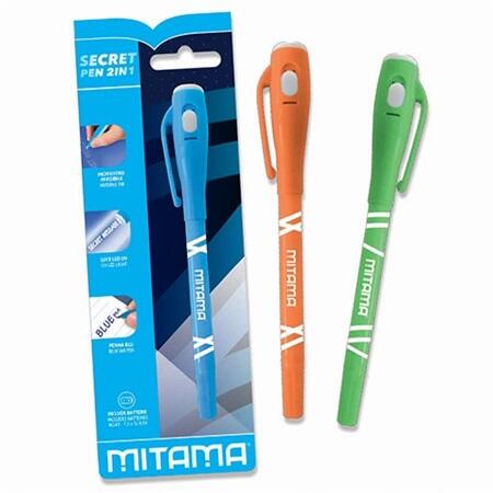 2 funkciós varázstoll Egyik végén mágikus, láthatatlan tintával fogó heggyel UV fénnyel világító kupak, a szöveg megjelenítéshez Kék színű folyóstoll hegy, a toll másik végén