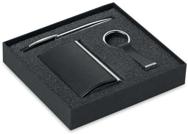 Üzleti ajándék szett Üzleti ajándék szett dobozban. Tartalma: csavarmechanikás fém golyóstoll feketén író betéttel, rozsdamentes acél és PU kulcstartó, névjegykártya tartó.