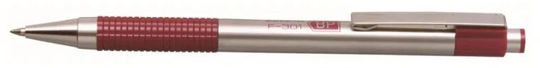 ZEBRA Golyóstoll F-301 0,7 bordó, kék betétte A ZEBRA F-301 nyomógombos golyóstoll fémből készül, fogórésze bordó, bordázott. Cserélhető betétes (F betét), tintája kék színű, írásvastagsága 0,24 mm.