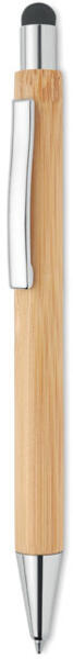 Bambusz toll érintőheggyel Nyomógombos érintőhegyes golyóstoll, fényes króm szerelvényekkel. Kéken író betét. A bambusz természetes anyag, termékenként szín- és méretbeli eltérések jelentkezhetnek, ami befolyásolhatja a dekoráció végső eredményét.