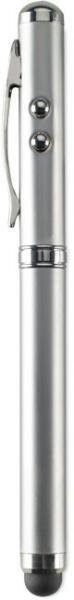 Lézermutató érintőheggyel Fém lézermutató. Fehér LED, piros lézermutató fény és puha érintőhegy vég. A működéshez szükséges 3 db LR41 gombelemmel szállítjuk. Bádogdobozban.